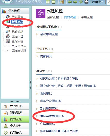 2、點(diǎn)擊新建流程----選擇獸醫(yī)學(xué)院用印審批;