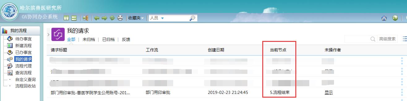 3、查看審批結(jié)果,當(dāng)前節(jié)點(diǎn)為“流程結(jié)束”即可到研究所辦公室(綜合樓4089室,不是獸醫(yī)學(xué)院樓)蓋章。